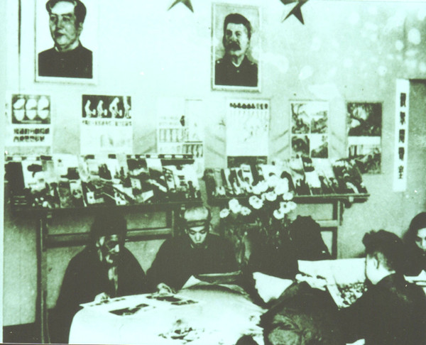 改造后的大世界阅览室,挂有毛泽东、斯大林像